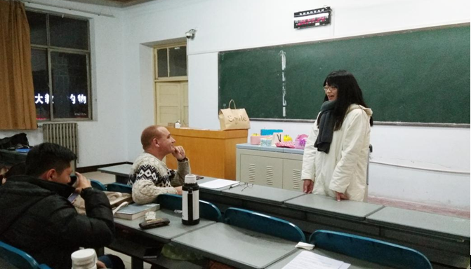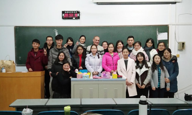 这种活泼有趣的授课方式使得课堂气氛总是很热烈,常常能看到同学们积极参与热烈讨论的景象,寒冷的冬天似乎在这里也变得温暖了。实验班的同学提到Marek都会不自觉带上一抹笑,孟晓静同学说,"Marek让我领略到了英语学习的乐趣,这门课的训练也使我在用英语交流时变得比以前大胆自如多了,不再那么胆怯,而英语学习最重要的就是要敢于张口嘛,我现在就喜欢上了英语";"Marek的课非常棒,很好玩!同时还能真正地帮助我们提高英语水平,我每次上这个课都觉得收获满满,还特别开心",孙晓文同学这么说。在欢声笑语中,英语会话这门课缓缓走向了本学期的末尾,最后一次课,大家在不舍与感激中,在圣诞节的温馨气息中一一与Marek道别,并在教室里合影留念。